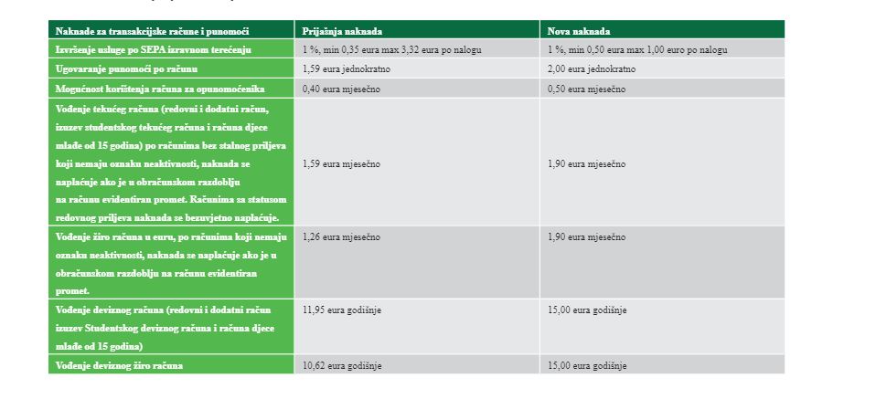 – tekući račun u eurima – sada od 0,71 do 1,19 eura mjesečno, a nova cijena od 0,97 eura do 1,61 eura mjesečno