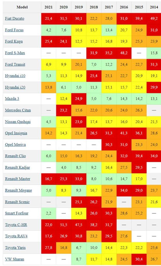 Opel Insignia, pak, bila je najlošija u segmentu srednje veličine, s iznadprosječnim stopama neuspjeha posebno u modelskim godinama 2015.-2018. Također su zabilježeni vrlo česti pozivi za pomoć na cesti s Fordom S-Max (modelske godine 2016.-2018.), Toyotom RAV4 (modelske godine 2017., 2019.-2021.) i VW Sharanom (modelske godine 2015.). U luksuznoj / poslovnoj klasi nijedan automobil nije postigao osobito loše rezultate. Čak je i Opel Zafira iz 2015. godine, koja prošle godine nije imala dobre rezultate, sada ostala u narančastom, a u narančastom je još i Renault Trafic iz 2015. godine. Kod kombija, u većem su riziku od kvarova Fiat Ducato iz 2014., 2015., 2016., 2019., 2020. i 2021. U crvenom je i Renault Master iz 2019.-2021., a zacrvenio se i Mercedes Citan iz 2020. godine.