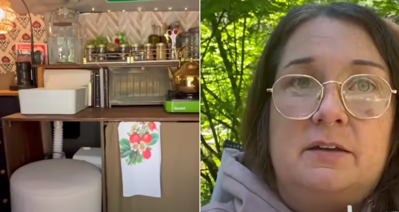 Rowan ima mini kuhinju kojoj se može pristupiti iznutra i izvana, opskrbljenu posuđem, štednjakom, namirnicama i priborom za pranje posuđa. Nastavila je: ‘Obično je koristim iznutra, ali ako sam u kampu, lijepo je kuhati vani. Mogu zapravo sjediti na krevetu i raditi u kuhinji, a tu je i moj dnevni boravak’.