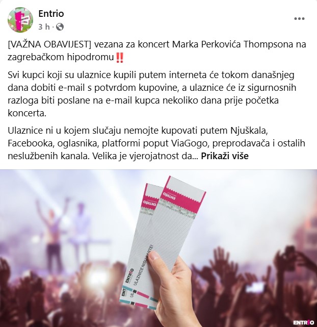 Ulaznice za koncert kupujte isključivo preko službenih kanala, poput Entrio.hr, koji osigurava autentičnost i sigurnost transakcije. Ako imate bilo kakvu sumnju u ispravnost ulaznice, obratite se korisničkoj podršci Entria ili samom organizatoru. Na dan koncerta reklamacije za ulaznice kupljene izvan službenog sustava neće biti moguće.